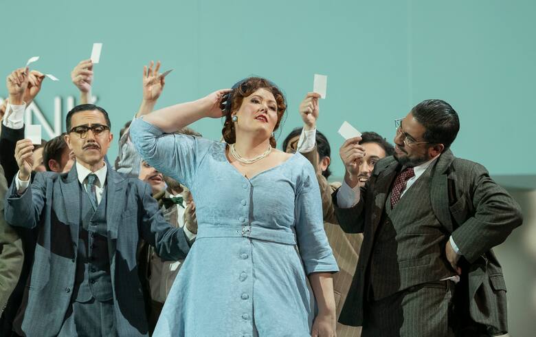 En la muy buena idea de Damiano Micheletto, la embajada de Pontevedro en París –donde transcurre el primer acto– devino en el Banco de Pontevedro en el que todo remite a los años 50. Si de dinero se habla, qué mejor que hacerlo en una entidad financiera. En un amplísimo escenario despojado, con algunos de sillones en su centro y sin cámaras acústicas perceptibles, los cantantes, casi en su totalidad, fueron percibidos con claras dificultades. La voz sólida y opulenta de una gran soprano como Carla Filipcic-Holm solo podía ser apreciada nítidamente cuando se paseaba por su registro agudo en tanto que, con menor fortuna y aún más escasa audibilidad, deambuló el resto del elenco por todos los espacios del escenario, salvo cuando se “estacionaban” para cantar en el proscenio y ahí sí podían exponer sus virtudes. El único que sentó presencia firme sin importar su ubicación, como actor o como cantante, fue el notable y veterano bajo alemán Franz Hawlata. Afortunadamente, el primer acto concluyó y con él las grandes escenas de conjunto. En los otros dos actos, todo funcionó mucho mejor.